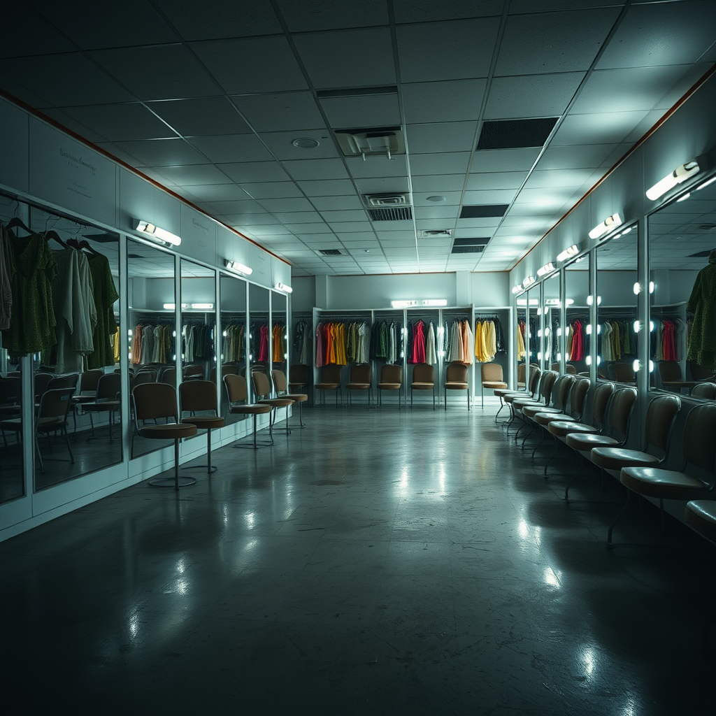 An abandoned dressing room lies silent, its mirrors reflecting rows of vacant seats, costumes hanging on racks like forgotten dreams, illuminated by the soft glow of unattended vanity lights casting long shadows across the polished floor.