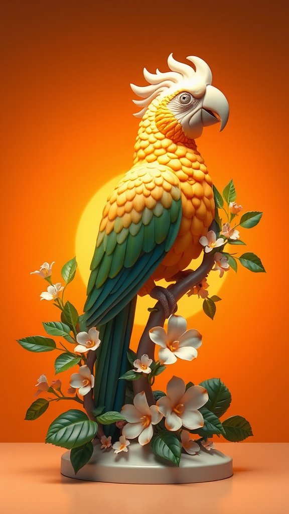 An abstract 3D sculpture of a parrot, intertwined with lush foliage and delicate flowers, gently radiates a soft glow against a warm, sunset orange backdrop.