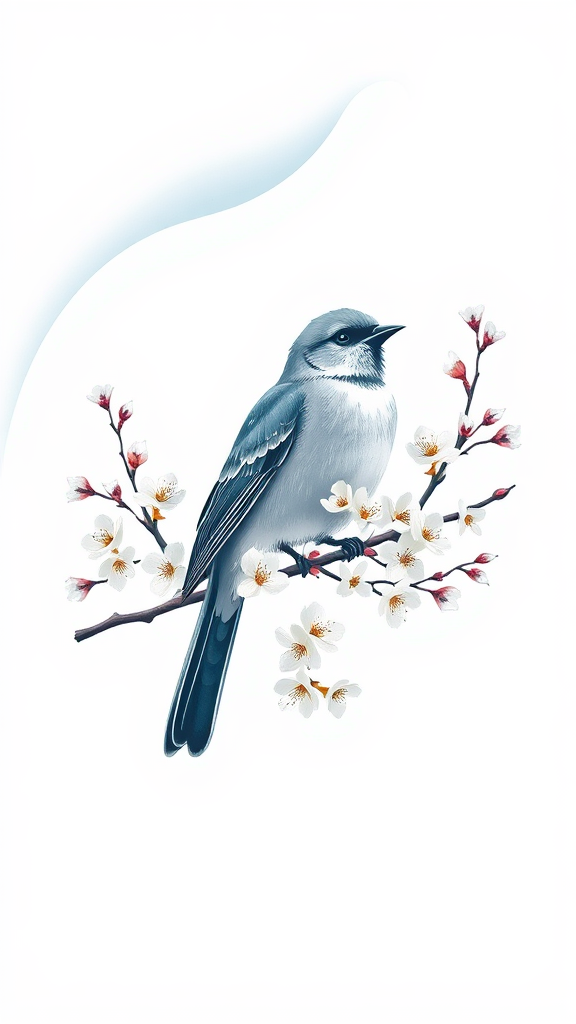 An abstract aesthetic vintage t-shirt design featuring a serene bird perched on a blossoming branch, infused with timeless classical elements reminiscent of Don Martin's style. The composition includes a gradient blue edge against a clean white background, capturing a sense of HD clarity and elegance. The scene is enriched with subtle creative touches, enhancing the overall harmony and maintaining the core concept.