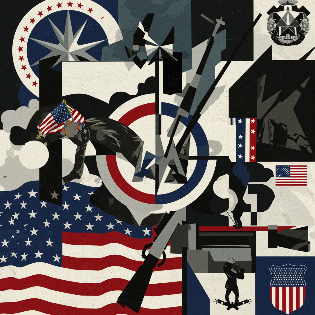 An abstract composition in the style of Marsden Hartley, features an array of patriotic elements and military symbols interwoven with bold geometric shapes. The image is defined by strong outlines and a vibrant color palette where dominant whites, reds, and blues create a stark contrast. These elements are orchestrated in a rhythmic structure, exuding emotional intensity. The interplay of color and form captures the essence of American modernism, channeling Hartley's signature approach. The overall composition showcases a balanced, yet dynamic interplay of symbolism and abstraction, with slight creative modifications that enhance the core concept.