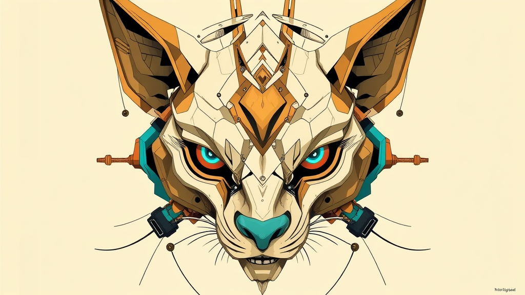 An abstract, cyberpunk-inspired head with animal-like features, blending elements of James Jean's intricate style and Aykut Aydogdu's surrealism. The composition is highly detailed and symmetrical, incorporating light brown and cyan hues. The artwork resonates with the satirical tone of Jeff Danziger, featuring futuristic elements that create a dynamic balance. The illustration captures a sense of otherworldly elegance, with subtle creative modifications that enhance the core concept's essence.