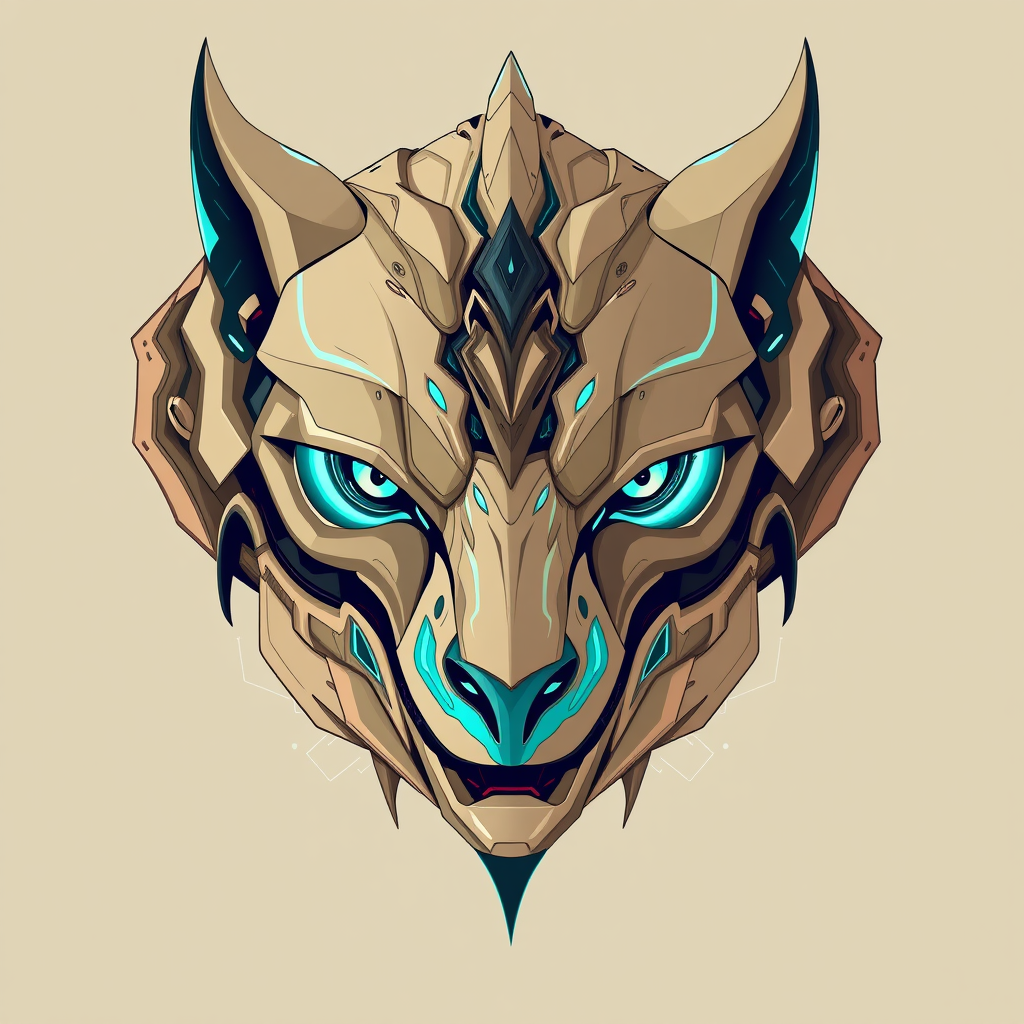 An abstract head with animal-like features, crafted in a futuristic cyberpunk style, blending influences from James Jean with intricate, highly detailed illustrations. The color palette merges light brown and cyan, emphasizing symmetrical balance. The design echoes the artistic nuances of Jeff Danziger and Aykut Aydogdu, showcasing a harmonious blend of organic and mechanical elements, with illuminated accents and sleek, flowing forms, creating an ethereal yet powerful visage.