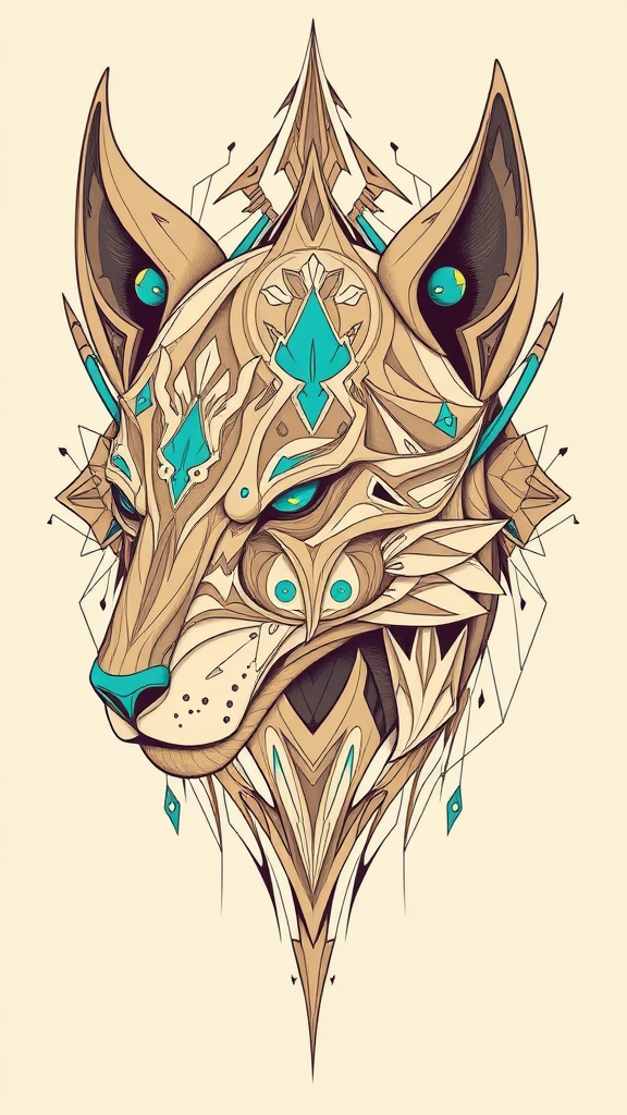 An abstract head with animalistic features in a futuristic cyberpunk style, inspired by the intricate and highly detailed illustrations of James Jean and Aykut Aydogdu, featuring a light brown and cyan color palette. The composition maintains a symmetrical balance with subtle influences of Jeff Danziger’s distinctive approach. The design embodies a sense of innovative complexity, merging organic forms with technological elements, highlighting the interplay between nature and futuristic aesthetics.