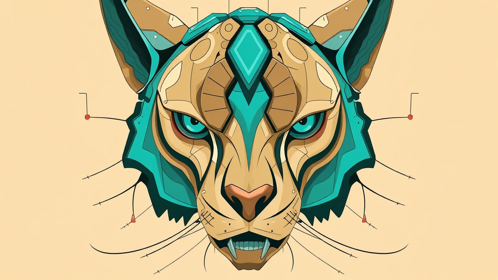 An abstract head with animallike features in a futuristic cyberpunk style, infused with the detailed intricacies of James Jean's art, showcasing a palette of light brown and cyan. The composition is marked by a symmetrical balance, with influences from Jeff Danziger and Aykut Aydogdu. The design is highly detailed, capturing a sense of modernity and surrealism with subtle creative alterations for uniqueness.