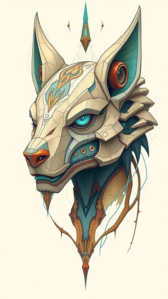 An abstract humanoid head featuring animallike features, crafted in a futuristic cyberpunk style reminiscent of James Jean. The composition is adorned with light brown and cyan hues, with intricate and highly detailed illustrations. A symmetrical balance is maintained, blending the distinctiveness of Jeff Danziger and Aykut Aydoğdu’s artistic influences. The artwork, characterized by its imaginative flair and intricate design, creates an execution that feels both familiar and innovative.