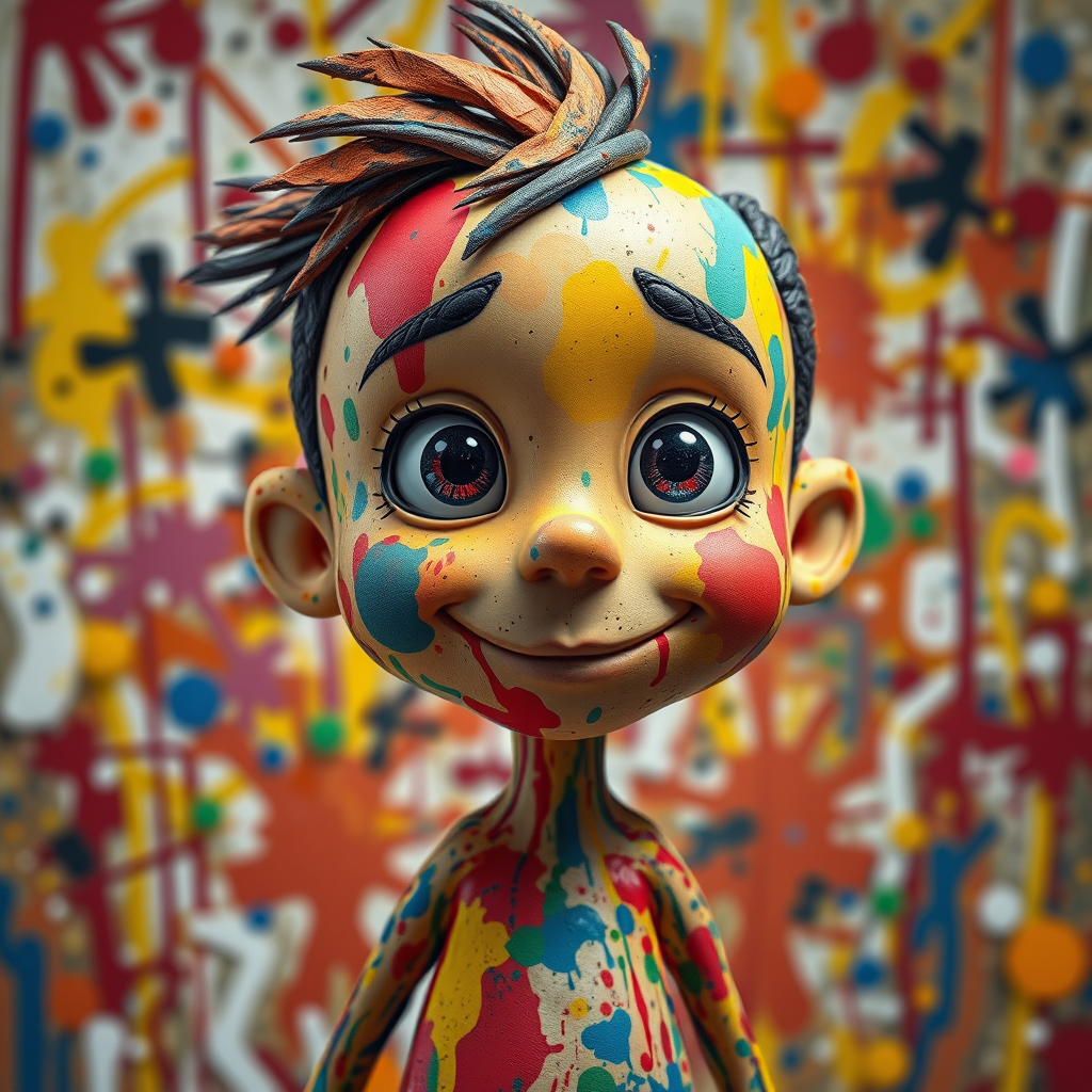 An abstract interpretation of an iconic cartoon character, featuring vibrant hues and an expressionist backdrop reminiscent of Jackson Pollock's dynamic style. The image is a full splash of color and energy, capturing the essence of high art suitable for a feature in MoMA magazine. This imaginative piece channels a wild and emotional narrative, blending impressionism with a modern 3D model rendered in Maya. The character's face and body are spattered with bold colors, enhanced by high-resolution textures in 4K quality, resembling professional photography. This award-winning artwork pushes boundaries and evokes a sense of wonder.