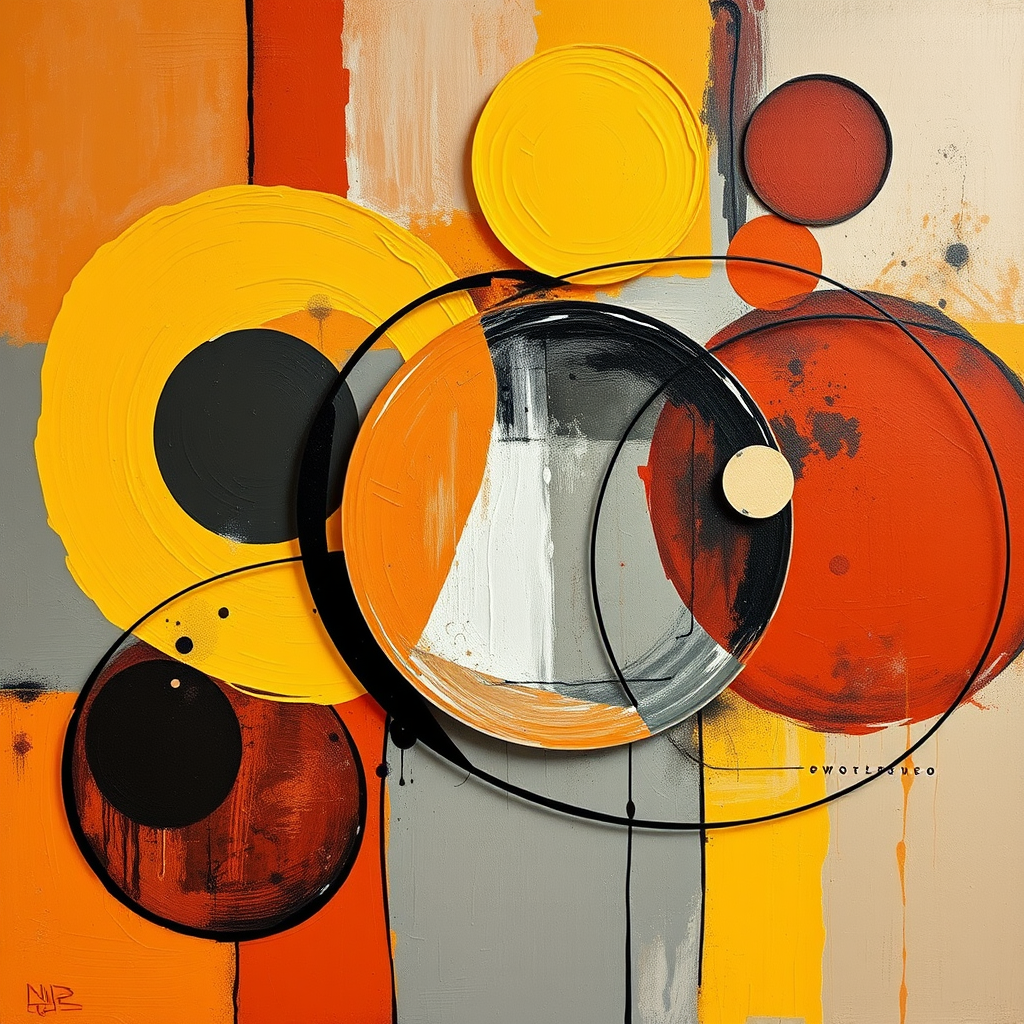 An abstract realism painting blending orange and grey hues with contemporary brush techniques, inspired by Bauhaus functional design. Infusions of light yellow and dark red evoke a dynamic palette with interwoven circular shapes reminiscent of Dmitry Spiros's style. Delicate abstract sculpture elements create layered, intricate compositions influenced by masculine neo-cubism, balancing complexity and coherence with a modern twist.