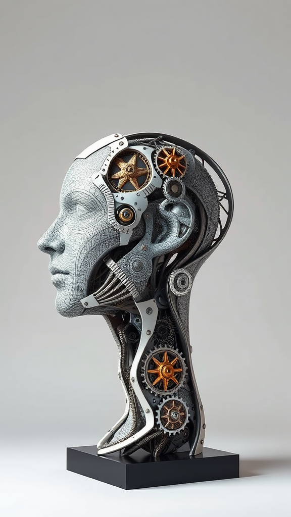 An abstract sculpture of a head and neck in slight profile, featuring skin composed of intricate patterns interwoven with gears and mechanical elements, creating a harmonious blend of organic and technological aesthetics. The design is realized in digital realistic concept art with ultra-detailed, photorealistic quality. The color palette includes muted whites, deep blacks, earthy browns, subtle blues, metallic gold, and silver hues, set against a light gray background with gentle, diffused lighting eliminating shadows. The sculpture stands independently without a base, maintaining the core essence while introducing fluidity to the mechanical features, giving the illusion of motion within the stillness.