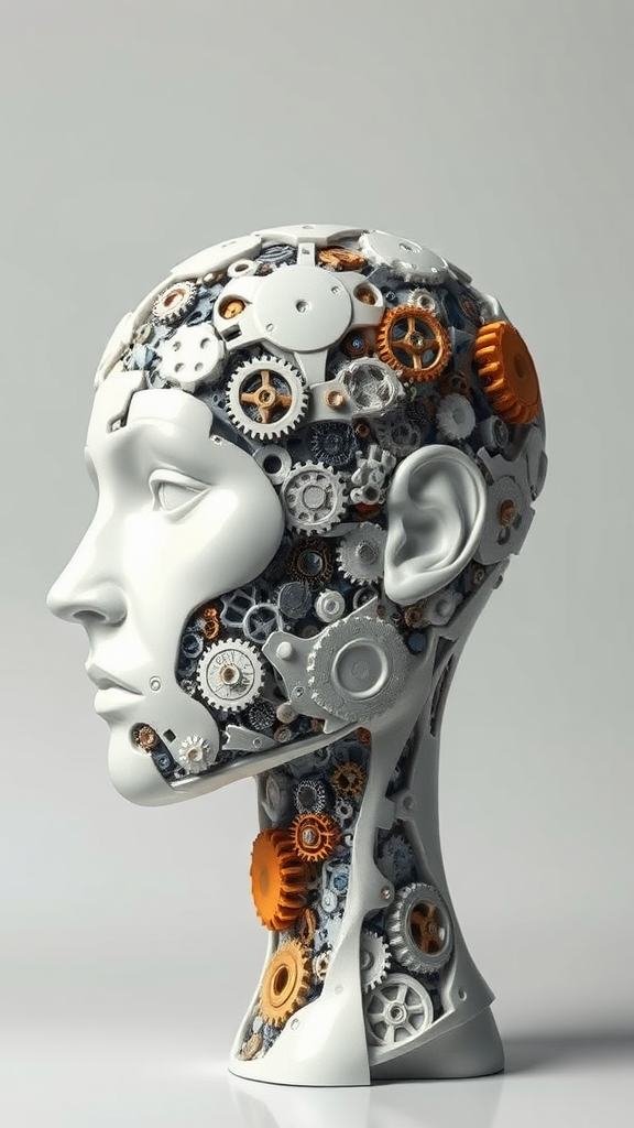 An abstract sculpture of a head and neck in slight profile, with the skin composed of intricate patterns of gears and mechanical elements, creating an organic yet technological appearance, crafted in the style of ultra-detailed, photorealistic digital concept art; the colors are soft and muted, featuring whites, blacks, browns, blues, gold, and silver, set against a light gray background with diffused lighting, ensuring no shadows cast on the subject. The sculpture has a smooth, streamlined quality, with gentle curvature and seamless integration of components, giving it a fluid, futuristic feel.