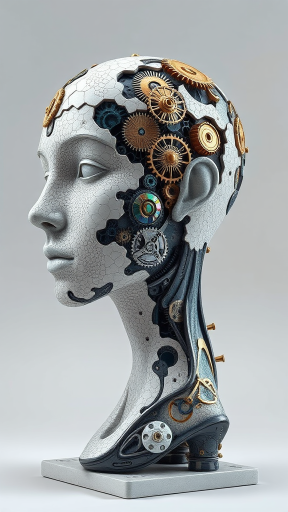 An abstract sculpture of a head and neck in slight profile, featuring skin composed of intricate patterns interwoven with gears and mechanical elements, blending organic and technological aesthetics, executed in digital realistic concept art style, ultra-detailed and photorealistic. The piece showcases muted tones of white, black, brown, blue, gold, and silver, set against a light gray background with diffused lighting that eliminates shadows on the subject. The sculpture appears to seamlessly rise from its base, with delicate engravings adding depth, and subtle iridescent highlights hinting at fluid motion within static form, conveying a harmonious fusion of nature and machine.