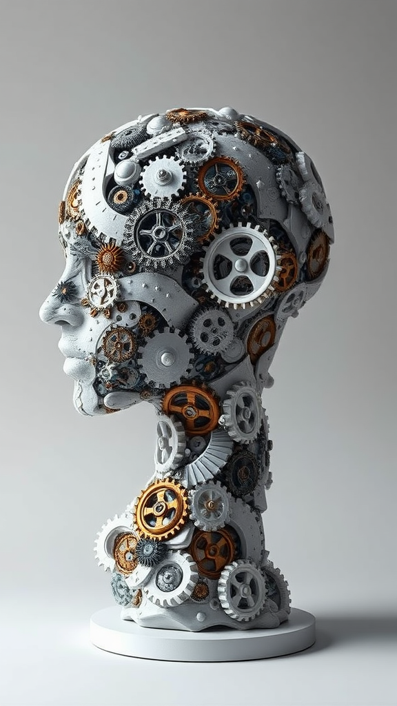 An abstract sculpture of a head and neck in slight profile, with skin composed of intricate patterns of interlocking gears and mechanical elements, blending organic and technological aesthetics. Rendered in the style of digital realistic concept art, ultra-detailed and photorealistic, featuring a muted color palette of whites, blacks, browns, blues, and metallic hints of gold and silver. Set against a light gray background with diffused lighting that highlights its complexity without casting shadows, maintaining a sense of ethereal weightlessness and elegance while showcasing subtle, artistic variations.