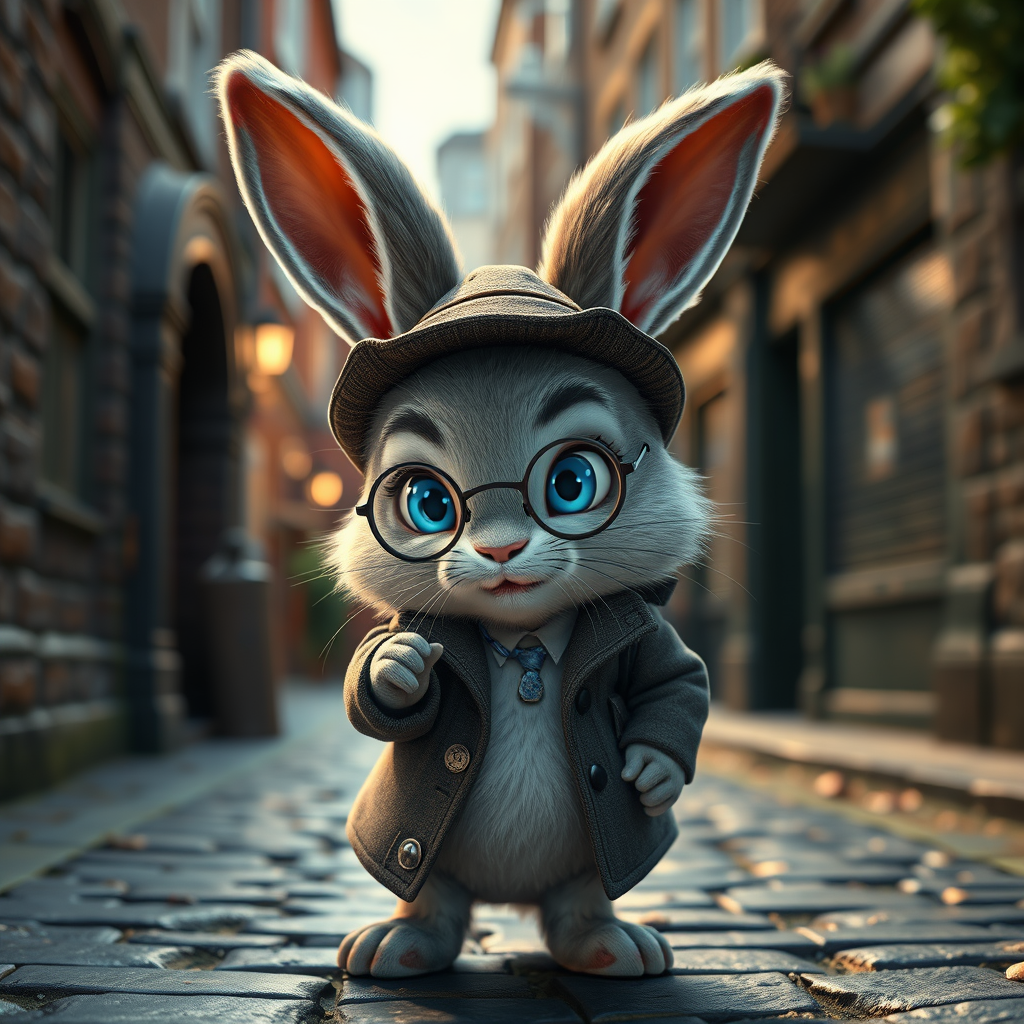 An adorable fluffy bunny cub dressed as Sherlock Holmes, with bright blue eyes, is investigating a whimsical mystery in the heart of old London. Rendered in a stunning Pixar-style, the scene is incredibly detailed and vibrant, capturing the essence of an animated film with a photorealistic touch. The cobbled streets of London provide a picturesque backdrop, with realistic lighting casting soft shadows and creating an immersive cinematic atmosphere. The composition is perfect, with every element meticulously arranged to enhance the bunny's curious expression and detective ensemble. The scene is brought to life with a boost of vivid colors and natural volumetric lighting that highlights the textures and depth, all masterfully rendered in Unreal Engine.