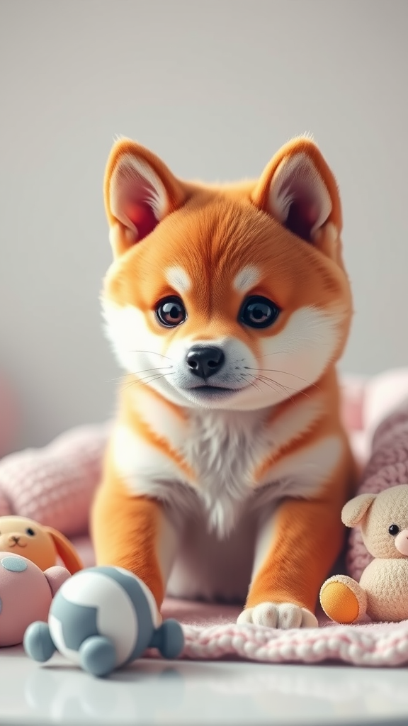 An adorable shiba inu puppy, depicted in a 3D octane render reminiscent of Fortnite style, with meticulous attention to detail, featuring studio lighting and gentle pastel colors. The puppy is surrounded by playful props like tiny toys and a mini blanket, adding charm to the scene. Its fur is rendered with ultra-realistic textures, showcasing intricate patterns and a soft, fluffy appearance. The puppy's expression is heart-meltingly cute, capturing a sense of mischief and innocence, sparkling eyes full of wonder and curiosity.