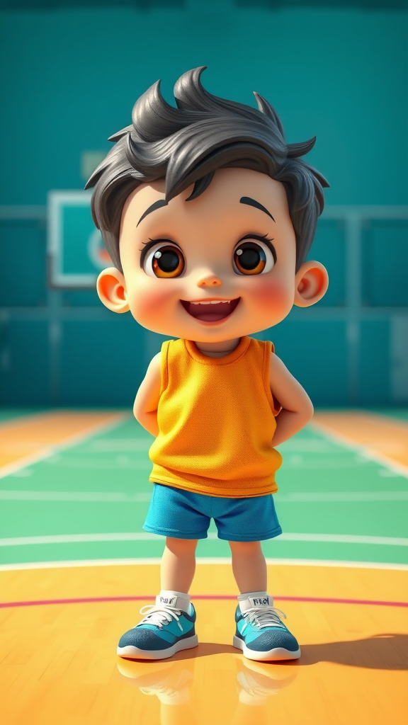 An adorable, sporty young boy with big, sparkling eyes stands gleefully on a pristine, brightly lit basketball court. He's wearing a vibrant basketball vest paired with blue shorts, exuding an aura of excitement and energy. His appearance is reminiscent of a whimsical character, reminiscent of Disney's charm, with finely detailed features and a glossy finish. The scene is vividly colorful, reminiscent of a high-quality 3D animation render, illustrating a character in a mockup blind box toy style. The portrayal is of the highest quality, capturing every nuance with precision, set against an 8k resolution that enhances every detail. This front-facing, close-up shot highlights his delightful expression and the fine luster of the scene, offering a dream-like, ultra-detailed vision of youthful enthusiasm.