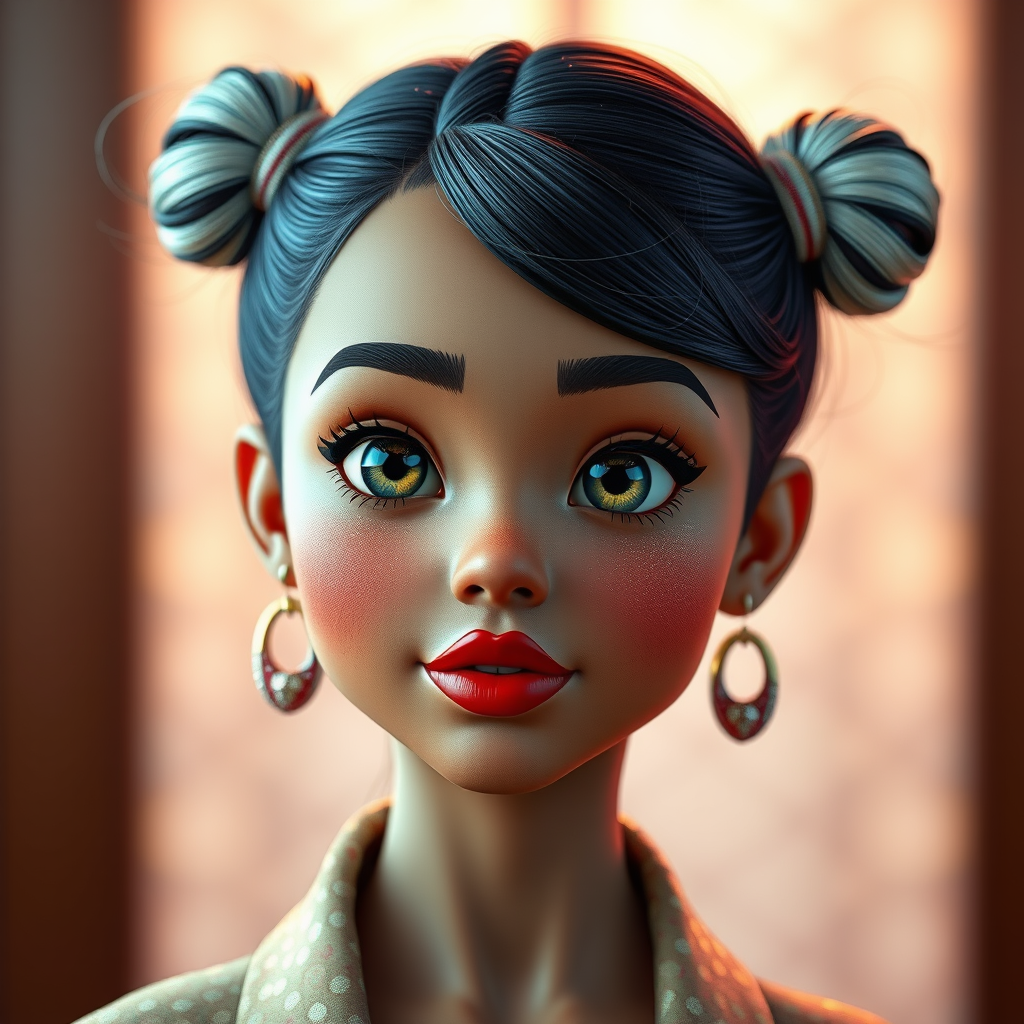 An adorable woman with playful top knots teeming with vibrant energy, showcasing delicate, intricate iridescent patterns. Her striking red lipstick complements her hyper-detailed, ultra-realistic 3D appearance, reminiscent of a blend between Pixar and Disney character art by Artgerm. Her face is meticulously detailed with crystal-clear realistic eyes, captured in sharp focus. Rendered with octane precision and ray tracing, the visual is an Ultra-High-Definition 8k HDR masterpiece. The model features a unique ethnic blend, presenting a captivating and harmonious representation.