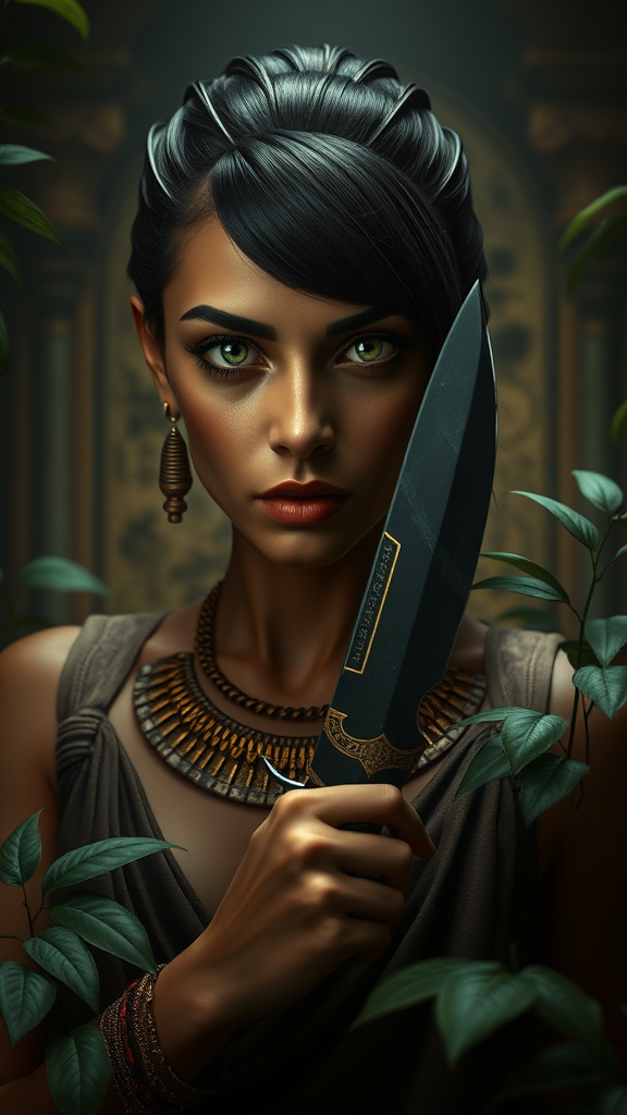 An adult Egyptian woman with striking green eyes and sleek black hair styled in traditional flaps, complemented by dramatic makeup, stands poised. Her upper body faces the viewer, set against an intricate backdrop. Her detailed face reflects the essence of Old Egyptian culture with a unique twist: she embodies the spirit of a feral jungle warrior. In her hand, an obsidian stone knife glints subtly, the scene enriched by encroaching bushes and lurking poisonous plants. The atmosphere exudes a humid, dark, cinematic quality reminiscent of a 1970s film, evoking a mysterious, dimly lit chamber with a tangible tension. High-frequency details capture every nuance as if painted with a brush, while the grainy texture of 35mm film adds an artistic layer. The ambiance is further enhanced by subtle film noise, infusing the artwork with a vintage yet timeless narrative akin to SAI Pixel Art.