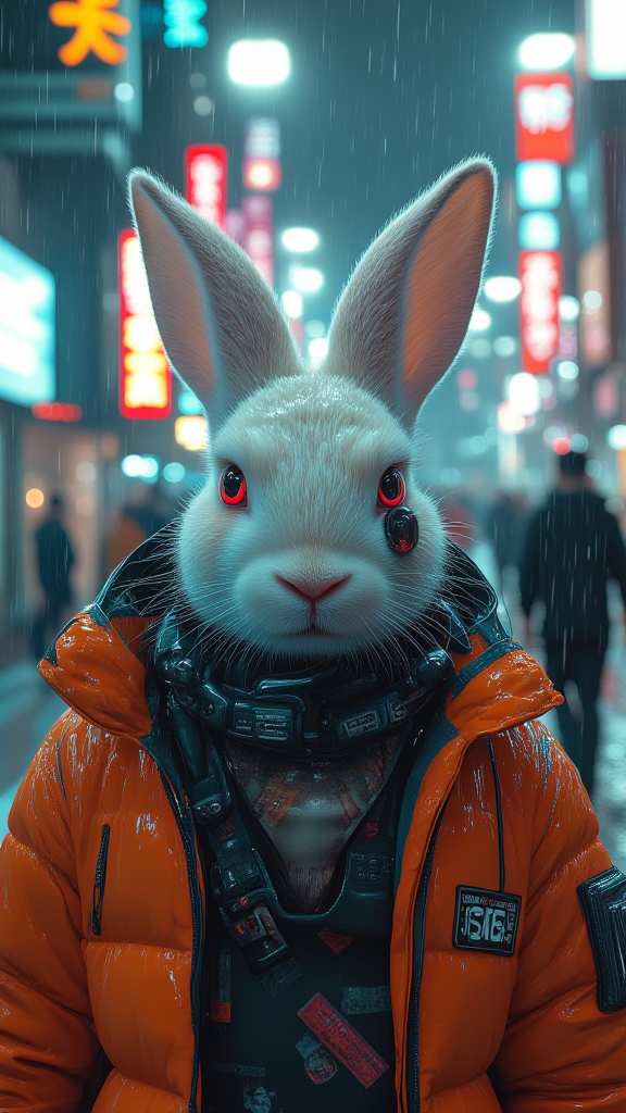 An adult white rabbit stands in a cyberpunk city, in the rain. Hes wearing a cyberpunk style jacket. The rabbit has an augmentation on his right eye and a lot of scars. Kierpunk implants are visible on the rabbit. A masterpiece, maximum detail, cinematography