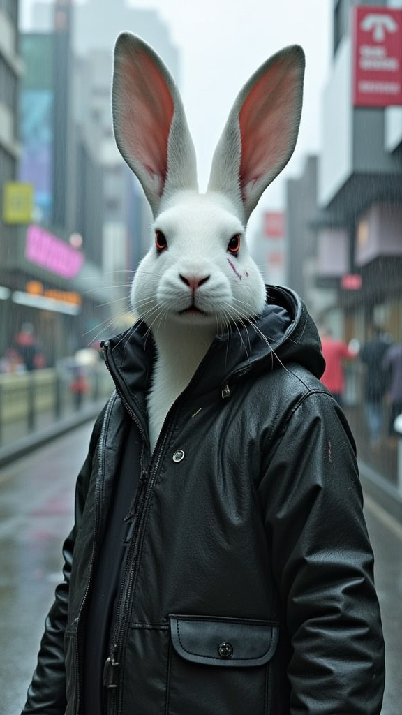 An adult white rabbit stands in a cyberpunk city, in the rain. Hes wearing a cyberpunk style jacket. The rabbit has an augmentation on his right eye and a lot of scars. Kierpunk implants are visible on the rabbit. A masterpiece, maximum detail, cinematography