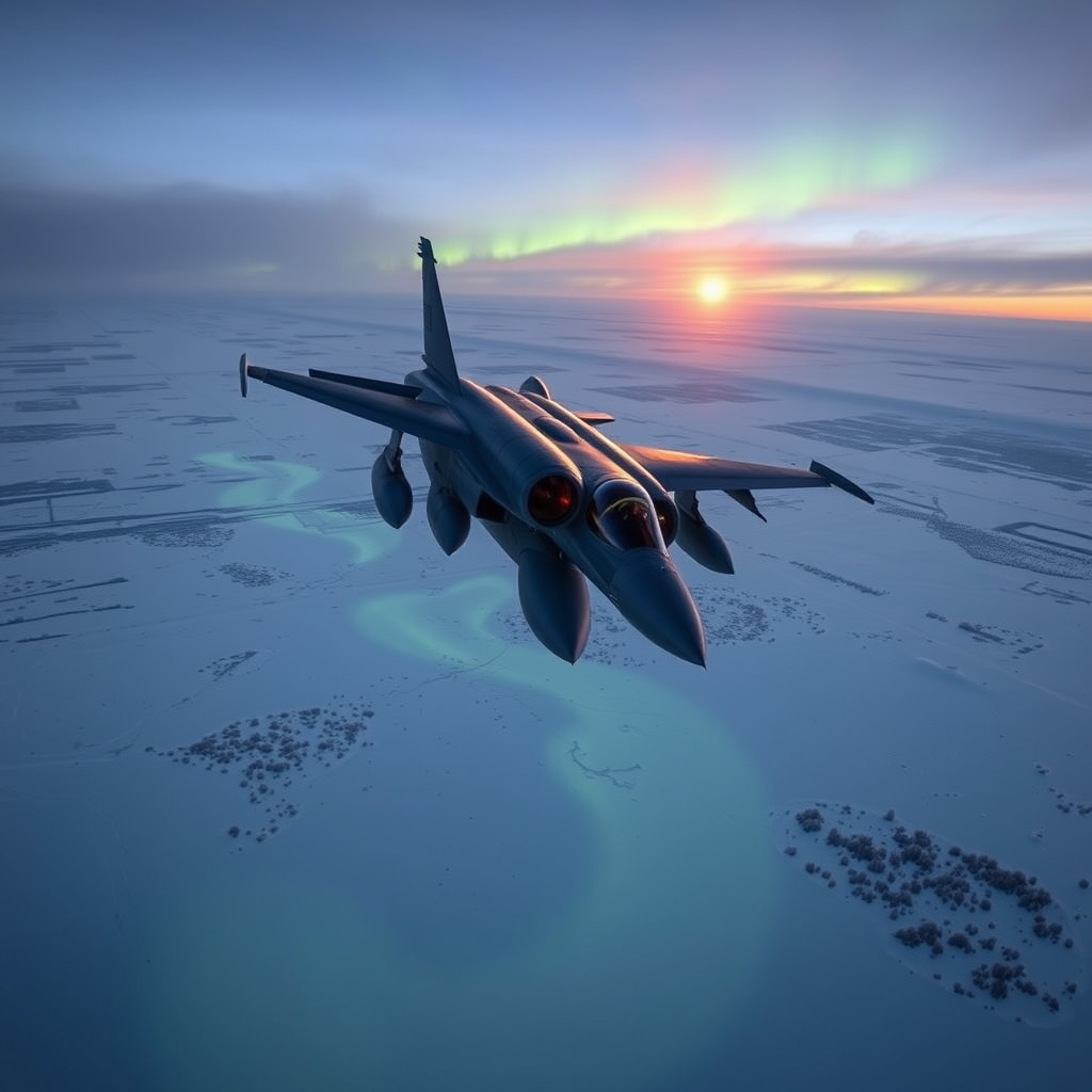 An advanced F-15S/MTD soars effortlessly over the vast, icy expanse of the tundra, its sleek frame reflecting the cold, pale sun. The roar of its engines echoes through the desolate landscape below, where patches of snow and hardy vegetation dot the frozen ground. Amidst soft flurries of snow, the jet maneuvers with graceful precision, slicing through crisp, icy air as auroras dance in ethereal greens and blues against the twilight sky.