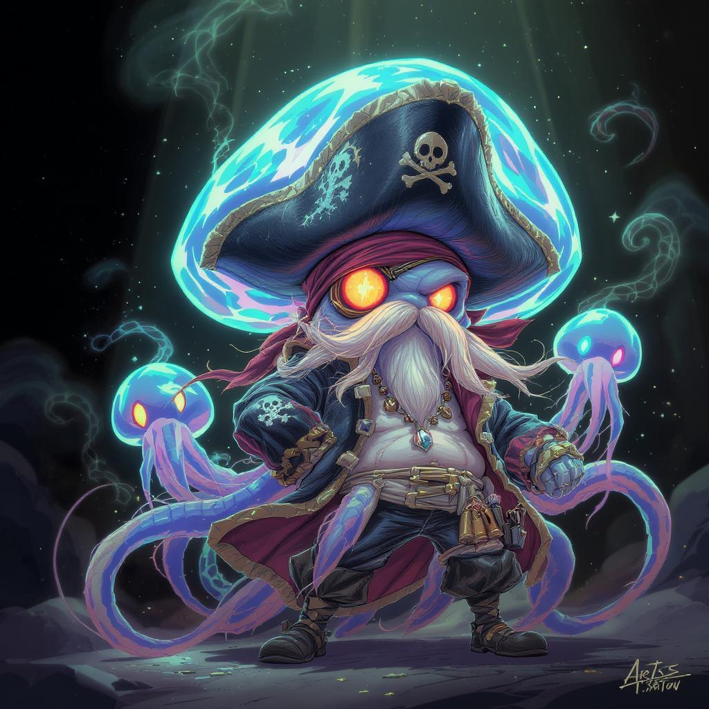 An adventurous anthropomorphic jellyfish pirate with multiple luminescent heads, striking a confident pose in a detailed character portrait. The scene is backlit, with vibrant light rays filtering through the translucent jellyfish features. The design is a trending piece on ArtStation, featuring a playful cartoon style with a vector art aesthetic. The pirate sports a whimsical array of pirate attire, highlighting the fluidity and ethereal nature of a jellyfish, while incorporating distorted elements that emphasize its unique form. The closeup showcases intricate textures and lively expressions, creating an engaging and dynamic composition.