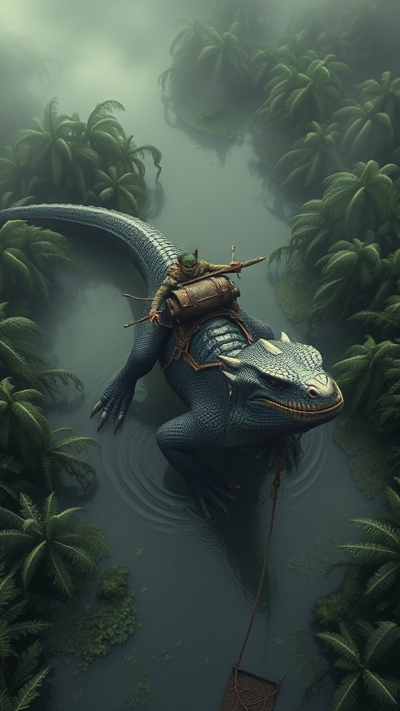 An aerial cinematic scene inspired by Dungeons & Dragons reveals a goblin riding a monstrous reptile through a vast wetland, viewed directly from above. The lizard, marked by subtly iridescent scales, fitted armor, and a weathered saddle, showcases a harmony with the lush environment, scaled to match the surrounding dense trees and misty waterways. The wetland presents a muted palette, enveloped in a smoky ambiance that complements the dense vegetation and shimmering aquatic surfaces. The goblin, though small beside the towering lizard, retains proportional accuracy, adding depth to the epic fantasy setting. Subdued lighting accentuates the rich textures of the swamp, the intricate details of the lizard's scales, and the goblin's adventurous posture. The entire scene, captured with a cinematic eye, exudes an atmospheric complexity that balances the fantastical elements with the natural beauty of the setting.
