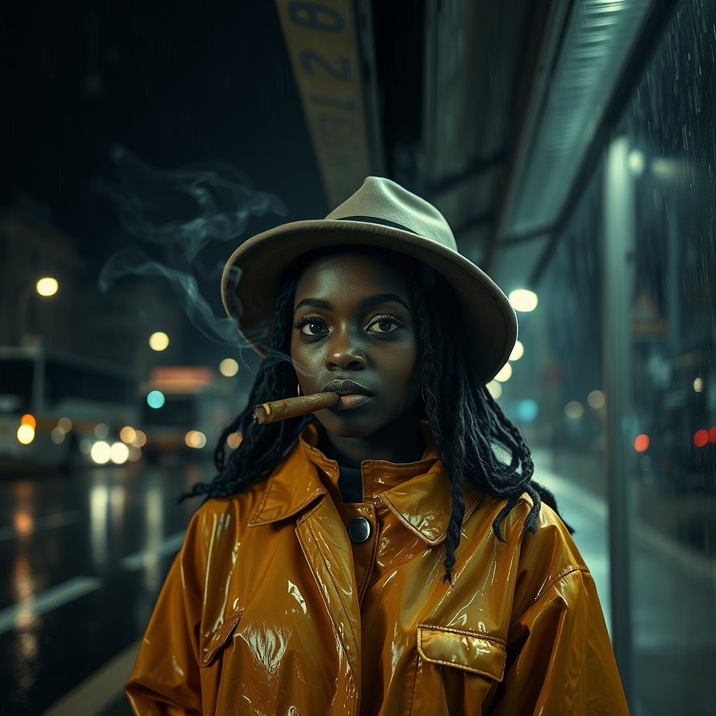 An African girl in a raincoat stands under dim streetlights at a night city bus stop, her black hair glistening from the rain. She wears a vintage hat that shadows her intense eyes as she smokes a cigar, the wisps of smoke curling upwards into the damp night. The distant city hums softly, each droplet accentuating the noir atmosphere, as she waits patiently beneath the canopy, a silent observer of the rain-soaked world around her.