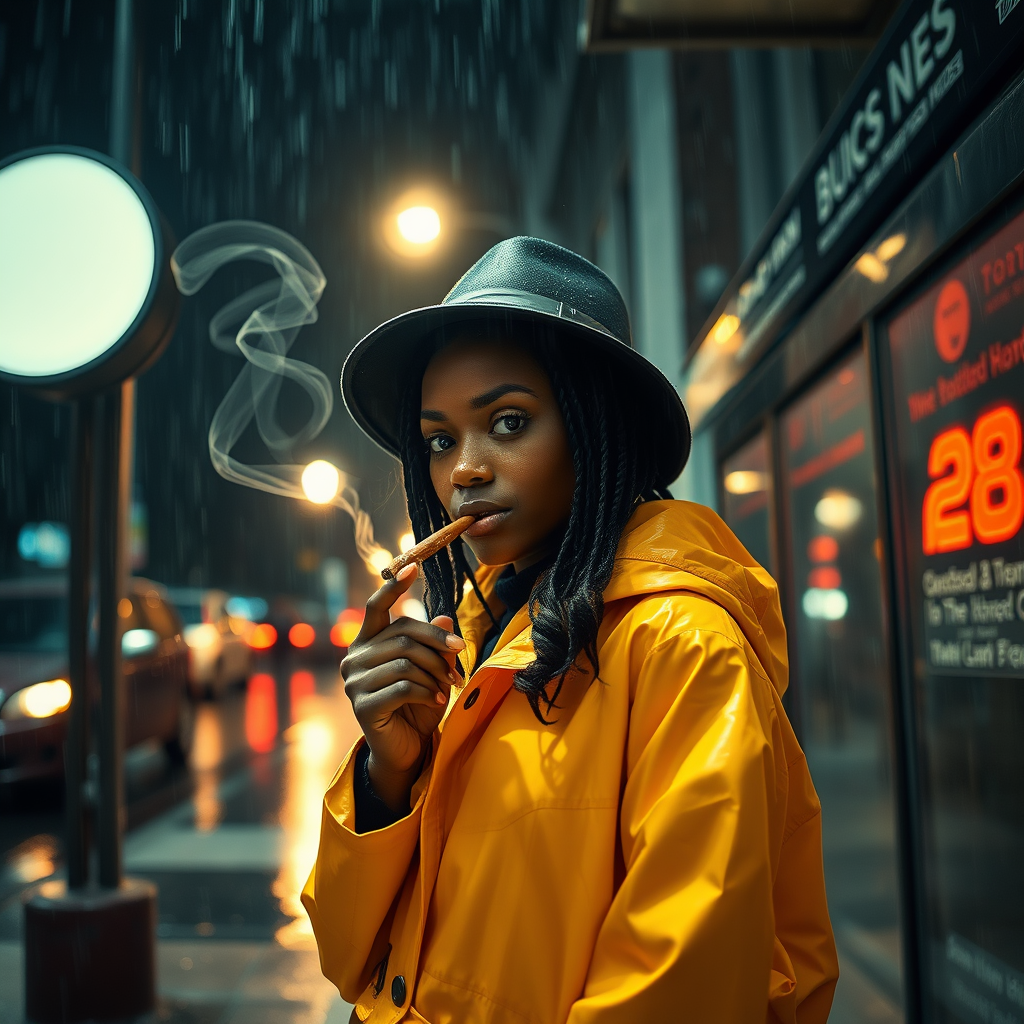 An African girl wearing a raincoat stands under a dim streetlight at a city bus stop, her black hair glistening with raindrops. It's a cool night in the bustling city, the rain creating a rhythmic symphony as it taps on her hat. She lights a cigar, the smoky tendrils swirling into the dark, misty air, adding an air of mystery. With an expression of calm anticipation, she watches the reflections of neon lights dance on the wet pavement, embodying the essence of noir in the rain-drenched night.