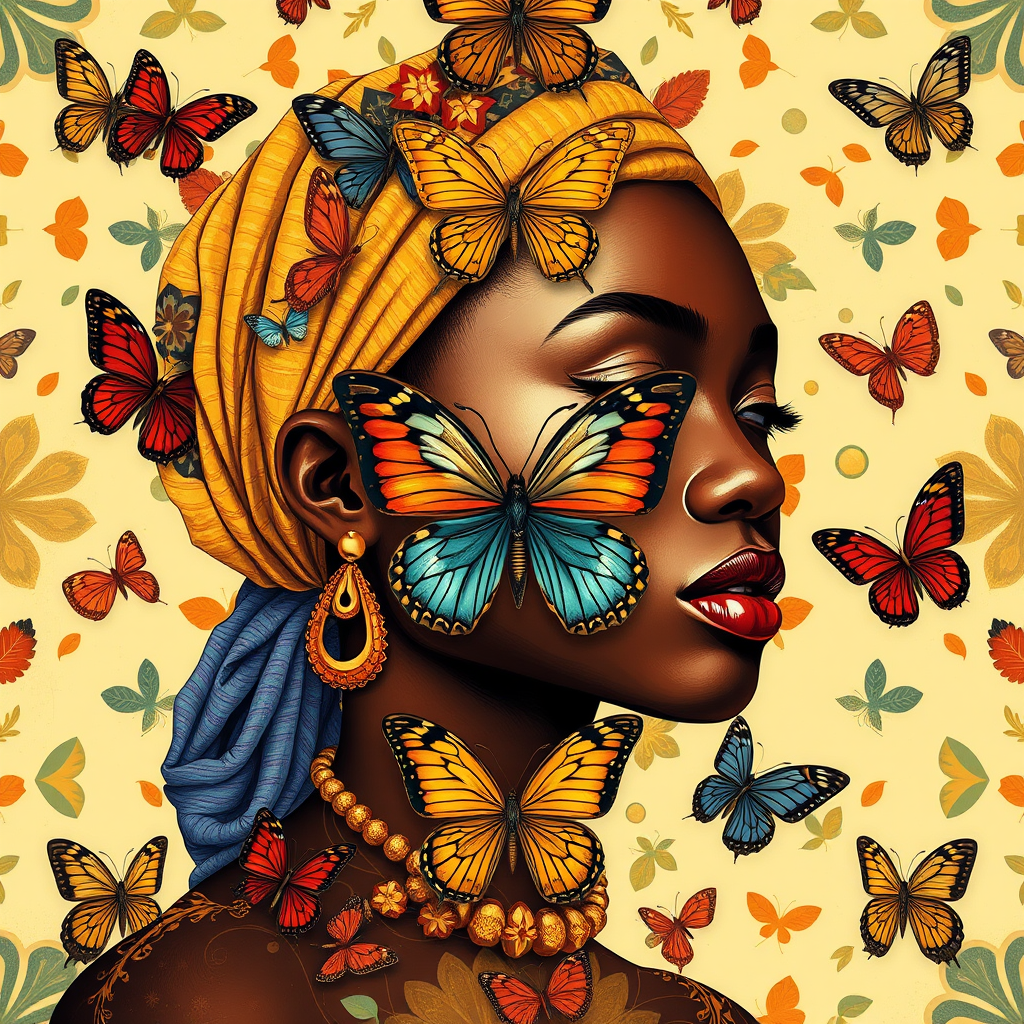 An African woman with a seamless butterfly pattern, inspired by the elegance of Damascus design, captured in a symmetrical vector illustration. The work echoes the styles of artists like Tom Bagshaw, Greg Rutkowski, Makoto Shinkai, Lois Van Baarle, and Ilya Kuvshinov. Featuring a luxurious color palette with splashes of vivid tones, the artwork is intricate and detailed, showcasing high quality and sharp, precise strokes reminiscent of oil paintings with expressive, heavy brushwork. The painting shows fluidity and vibrancy, focusing on beauty and harmony, with no grotesque or surreal elements, maintaining a focus on aesthetic grace and artistic integrity.