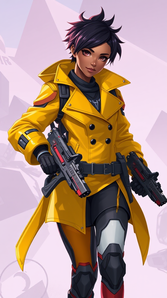 An afrofuturism anime-inspired female character in a vibrant yellow coat, resembling a fusion of Overwatch and Apex Legends styles. She exudes strength and agility, wielding dual futuristic guns with sleek designs. Her look blends elements of Loba Andrade's elegance and tactical prowess, with a touch of Brigitte's armor-like functionality for enhanced protection. Her short, dynamic hairstyle channels Lucio's energy, adapted to a feminine aesthetic. Her character design draws on Senna's ethereal presence from League of Legends and the sleek, modern edge seen in Valorant. The setting is a dynamic, cyber-enhanced world where technology and artistry collide, defining her as both a guardian and a warrior of a new era.