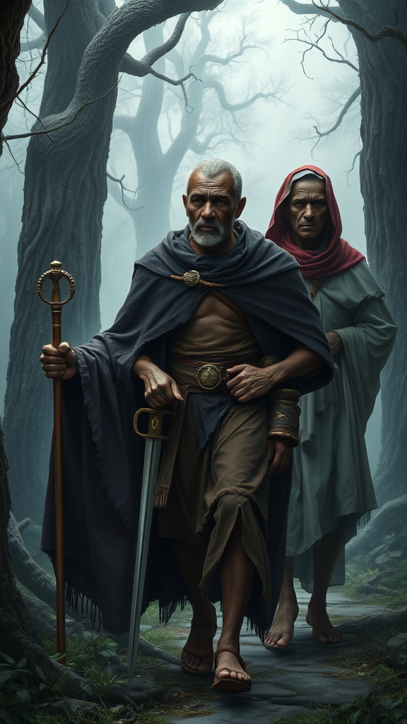 An aged and weary king, his sunken eyes reflecting the weight of his years, dons a frayed royal cloak of deep, muted purple. Clutching a staff adorned with ancestral symbols, he leads the way with cautious determination. By his side is Prince Chidi, his determined gaze and sharp jawline bespoke of his resilient spirit. His sturdy build is clad in a leather tunic, over which hangs a hunter’s dark cape, and his grip is firm on a ceremonial sword that glistens faintly in the half-light. The Chief Priest, a gaunt figure wrapped in flowing white and red robes, his attire intricate with beads and cowrie shells, follows with a solemn grace. His face is artfully marked with sacred symbols, giving him an aura of mystique. Together, they venture into the eerie depths of Kelunwa Forest, where ancient trees stand like spectral sentinels, their skeletal branches reaching for a sky obscured by swirling silver mist. Shadows twist and dance in the undergrowth, and the luminous eyes of unseen creatures pierce the oppressive darkness. At the heart of this otherworldly scene lies the mouth of a cave, gaping like a monster’s maw, shrouded in shadows and pulsating with a faint, ominous red glow. All are attuned to the foreboding energy that permeates the air.