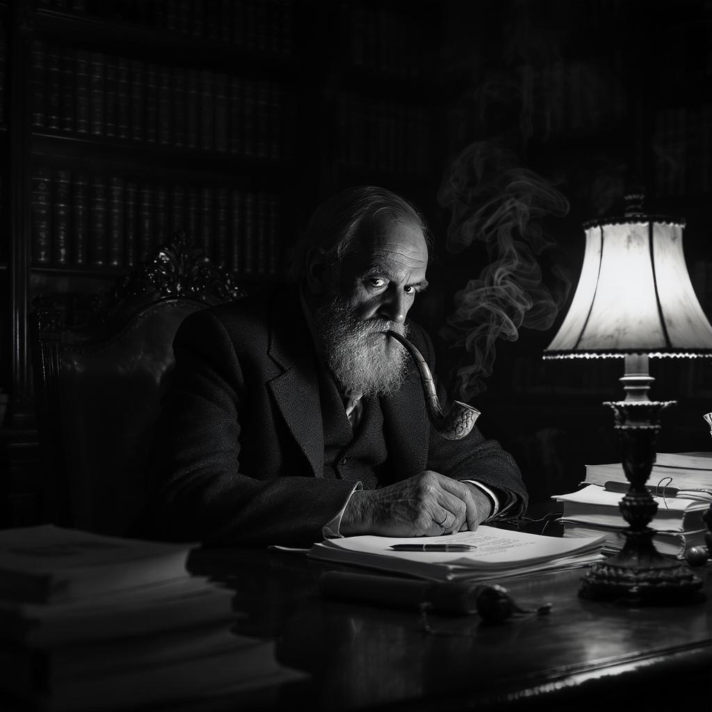 An aged author sits hunched over an antique wooden desk in a dimly lit office, the air thick with the curling smoke from his intricately carved pipe. His weathered face is a canvas of shadows, etched with deep lines and flickering in the eerie glow of a single desk lamp. The room is a study in black and white, with towering bookshelves casting menacing silhouettes against the walls. The atmosphere is hauntingly mysterious, filled with the ghosts of unwritten stories. The scene captures the essence of a bygone era, rendered in exquisite detail and lifelike clarity, as if caught by the precise lens of a Hasselblad H4D 200MS Digital Camera. The Mitakon Speedmaster 65mm f/1.4 XCD lens brings every nuance into sharp relief, while Fresnel lighting adds to the dramatic, cinematic quality of the moment.