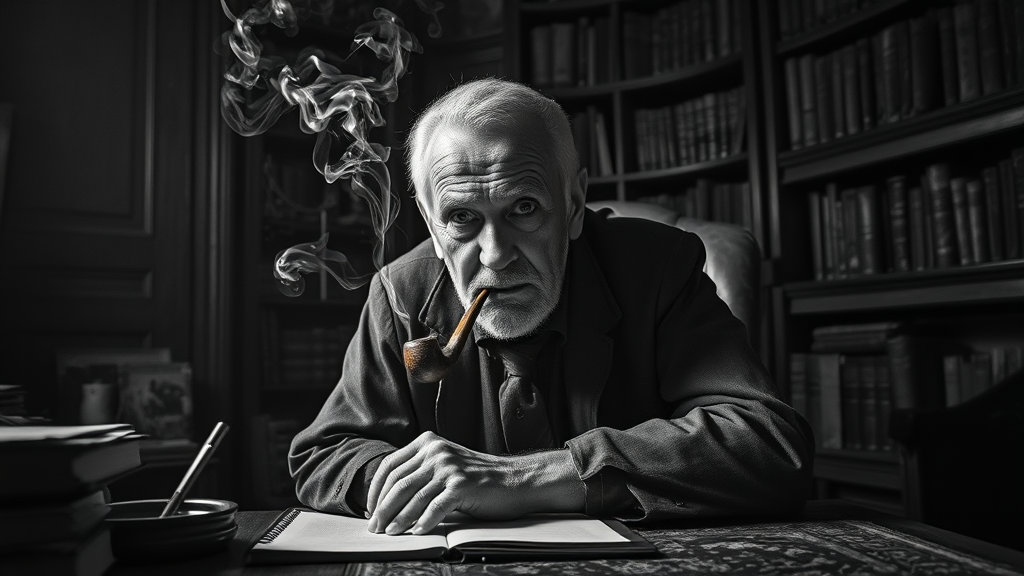 An aged author with deep wrinkles and a piercing gaze, enveloped in the tendrils of smoke curling up from his pipe, sits hunched over a cluttered desk in his dimly lit study. The scene, captured in black and white, exudes an eerie atmosphere, with shadows playing on the walls and highlighting the details of dusty bookshelves lined with forgotten tomes. The setting is rich with texture, from the worn leather of the armchair to the intricate patterns of an old rug on the wooden floor. Photographed in meticulous detail, the image has a cinematic quality, as though pulled from a suspenseful noir film, shot on a Hasselblad H4D 200MS Digital Camera with a Mitakon Speedmaster 65mm f/1.4 XCD lens, using Fresnel lighting to cast dramatic contrasts that accentuate the writer's intense expression and the timeworn, mysterious ambiance of his sanctuary.
