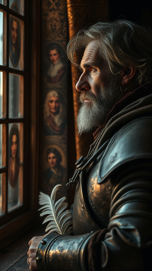 An aged d'Artagnan gazes pensively out of a dimly lit window, his once fiery eyes now a shadow of their former glory, etched with lines of wisdom and melancholy. His ornate armor, tarnished and worn, bears testimony to countless battles fought and victories won, yet his spirit seems burdened by untold stories of loss and regret. The muted glow of twilight casts a gentle light on the room, highlighting faded portraits of musketeer companions that adorn the walls, silent echoes of camaraderie that now seem worlds away. In his hand, he clutches a weathered feathered hat, emblematic of a vibrant past slowly slipping into memory, as a solitary tear traces down his cheek, speaking of a longing for days that will never return.