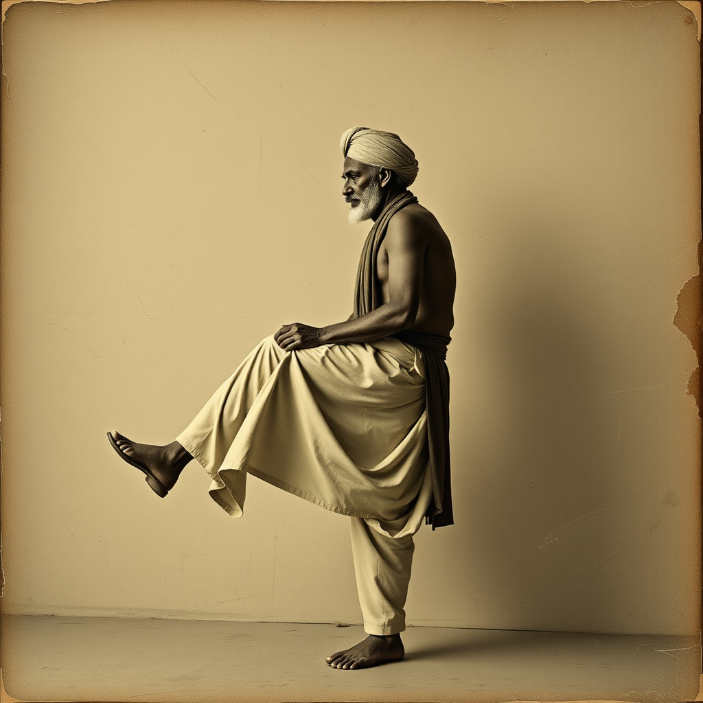 An aged photograph depicting an Indian man in a traditional turban with his legs gracefully elevated, infused with the aesthetics of distorted shapes and contemporary Middle Eastern and North African artistry from the period of 1860-1969, evoking a contemplative atmosphere, minimalist and understated, interwoven with photographic textures and featuring a crumpled appearance.