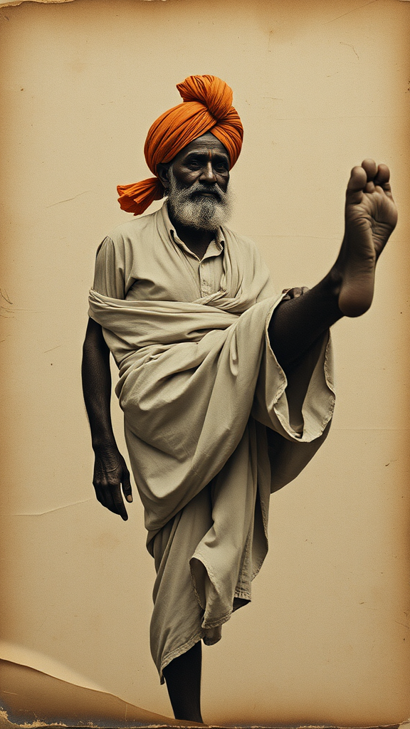 An aged photograph depicting an Indian man wearing a traditional turban, his legs elevated, rendered in disfigured forms. The piece evokes elements of mid-20th century Middle Eastern and North African art, characterized by a brooding atmosphere and minimalist aesthetic. The image is intertwined with photographic weavings and crumpled textures, capturing a vintage essence reminiscent of the era between 1860 and 1969.