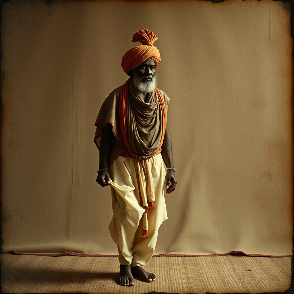 An aged photograph of an Indian man adorned in a traditional turban, his legs elegantly elevated, rendered in abstract forms reminiscent of contemporary Middle Eastern and North African art from the 1860s to 1969. The scene exudes a contemplative and moody atmosphere, characterized by its sparse simplicity. The composition features a blend of photographic texture and woven patterns, with an aura of gentle distortion, like crumpled fabric in a 3:4 aspect ratio.