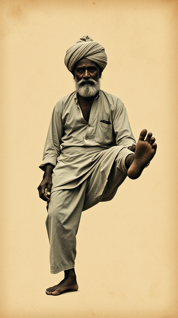 An aged photograph of an Indian man in a turban with his legs elevated, rendered in the style of distorted figures, inspired by mid-20th century Middle Eastern and North African art, capturing a brooding and introspective mood, minimalist and uncluttered, reminiscent of woven textures, subtly crumpled, aspect ratio 3:4, detailed and nuanced.