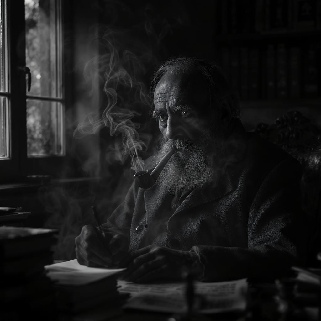An aged writer sits in his dimly lit office, the air thick with smoke curling from his pipe, his weathered face half-hidden in shadow. The room is filled with an eerie ambiance, as if stories of old haunt the very walls. The setting is captured in stunning black and white, with an almost unsettling clarity that feels both timeless and ethereal. The scene is richly detailed, each line and furrow of his skin painstakingly realistic, yet haunting. Illuminated by the sharp contrast of Fresnel lighting, the atmosphere is dense with mystery and creative tension. Photographed with the renowned Hasselblad H4D 200MS Digital Camera paired with a Mitakon Speedmaster 65mm f/1.4 XCD lens, the image achieves a cinematic quality that draws the viewer into its chilling depth, whispering secrets of tales untold.
