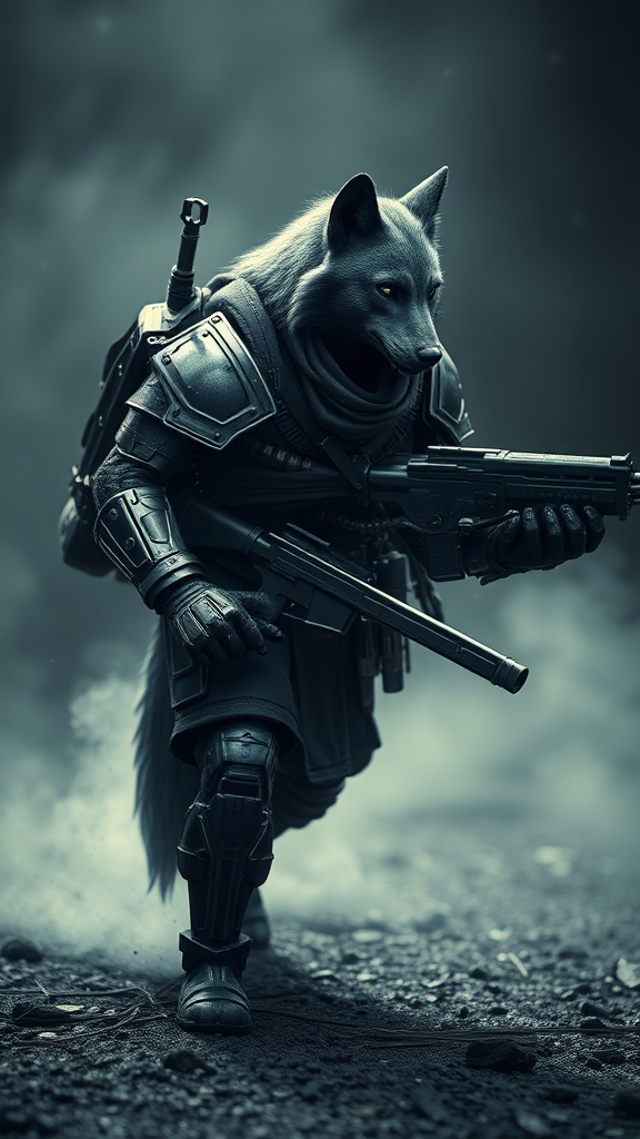 An agile black wolf warrior character, anthropomorphic figure, donning cutting-edge combat armor and advanced weaponry, featuring reflective surfaces, lifelike representation, intricately detailed, captured in dramatic cinematic lighting, ultra-high definition realism, 32k resolution, portrait view in an aspect ratio of 9:16, slight atmospheric enhancements for a dynamic, immersive effect.