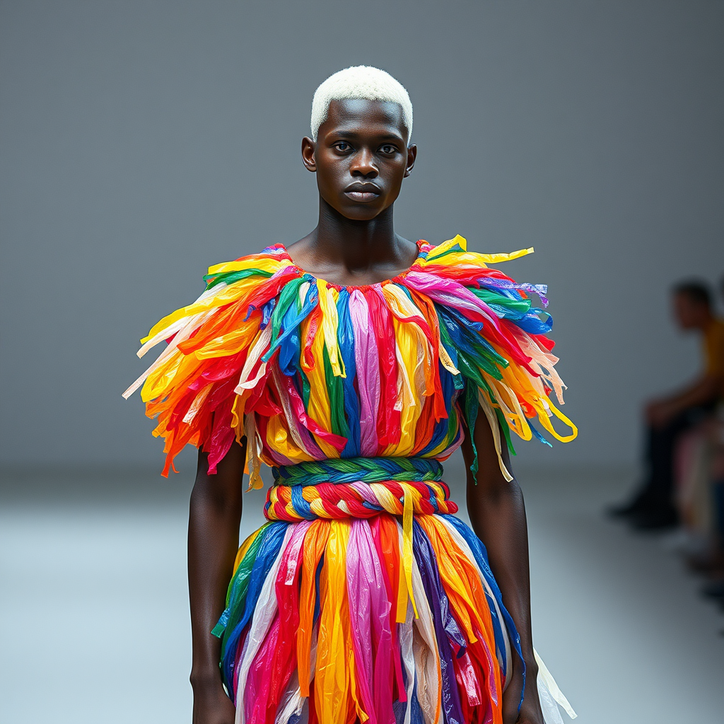 An albino male model captivates in a striking dress crafted from vibrant, woven plastic bags. This embodiment of daring expressionism and inclusivity showcases individuality and limitless style, celebrating the diverse allure of fashion.