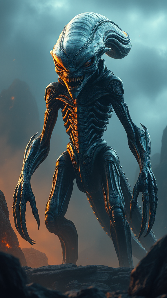 An alien creature, towering and fearsome, with a full-body presence exuding a menacing aura. Its skin is textured with intricate, otherworldly patterns that shimmer under an eerie light. Razor-sharp appendages and a formidable stance add to its terrifying demeanor, while piercing, intelligent eyes seem to penetrate the soul. The atmosphere is charged with tension as its presence dominates the landscape, its design highly detailed and realistic, evoking both awe and dread. The alien's fierce nature is matched by an unexpected elegance, hinting at a complex and ancient intelligence.