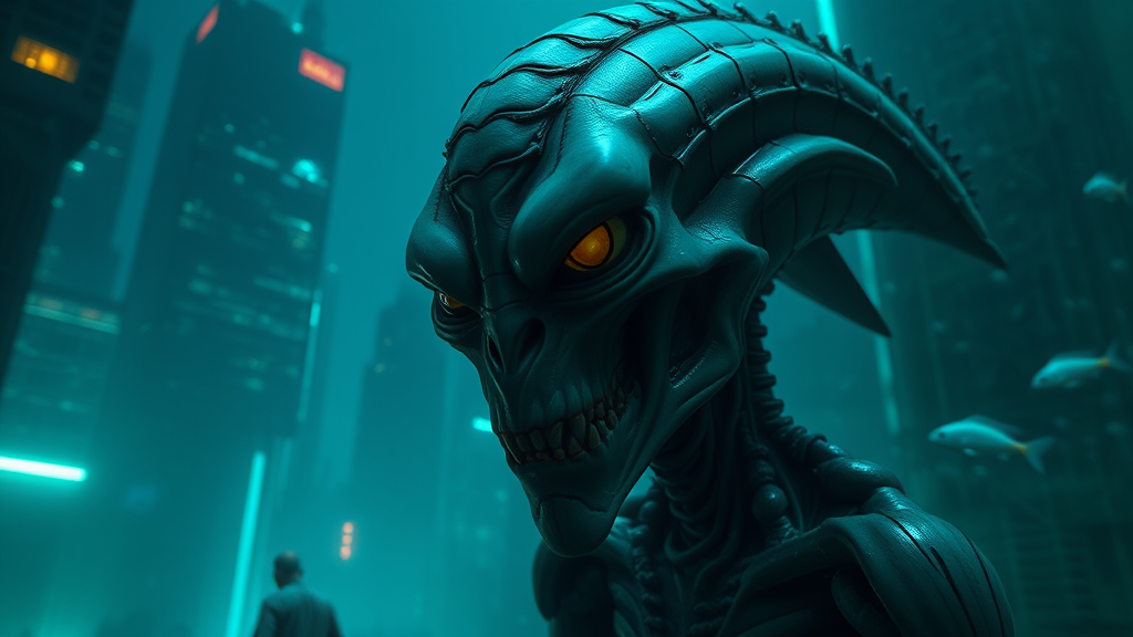 An alien Xarxos, twisted Lego-replica skin, exaggerated cheekbones, chilling gaze, anatomical details, mist-shrouded underwater environment in an abandoned cityscape, neon-lit ruins of skyscrapers, glowing bioluminescent fish swimming in the darkness, eerie whispering sounds of the unknown.