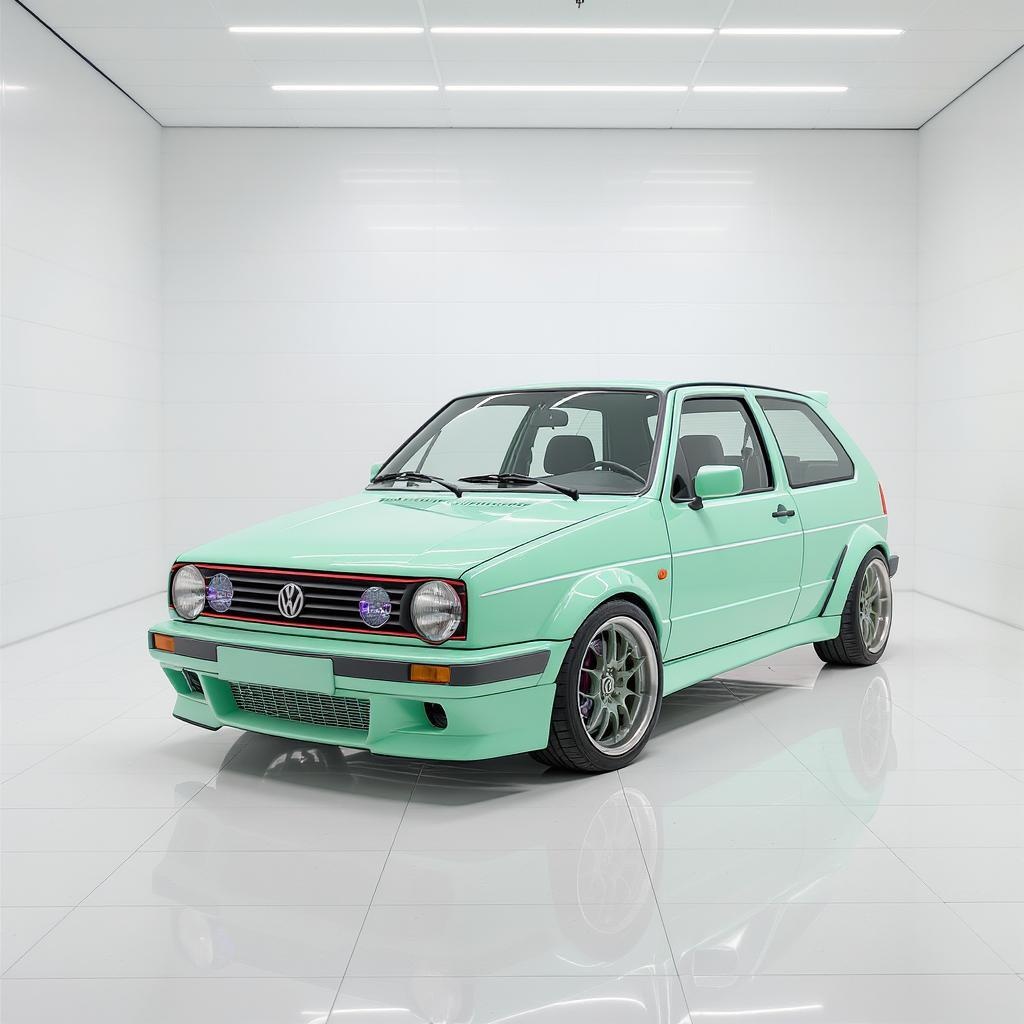 An all-white tiled room featuring a mint green Volkswagen Golf Mk2 GTI, illuminated in bright lighting with pastel shades enhancing the scene. The car boasts a perfect mint finish, surrounded by intricate fine details and textures highlighted in ultra-realistic, 8k resolution. The commercial photography style utilizes professional color grading to accentuate the overall freshness and modernity of the setting, with the scene captured in a 4:5 aspect ratio.