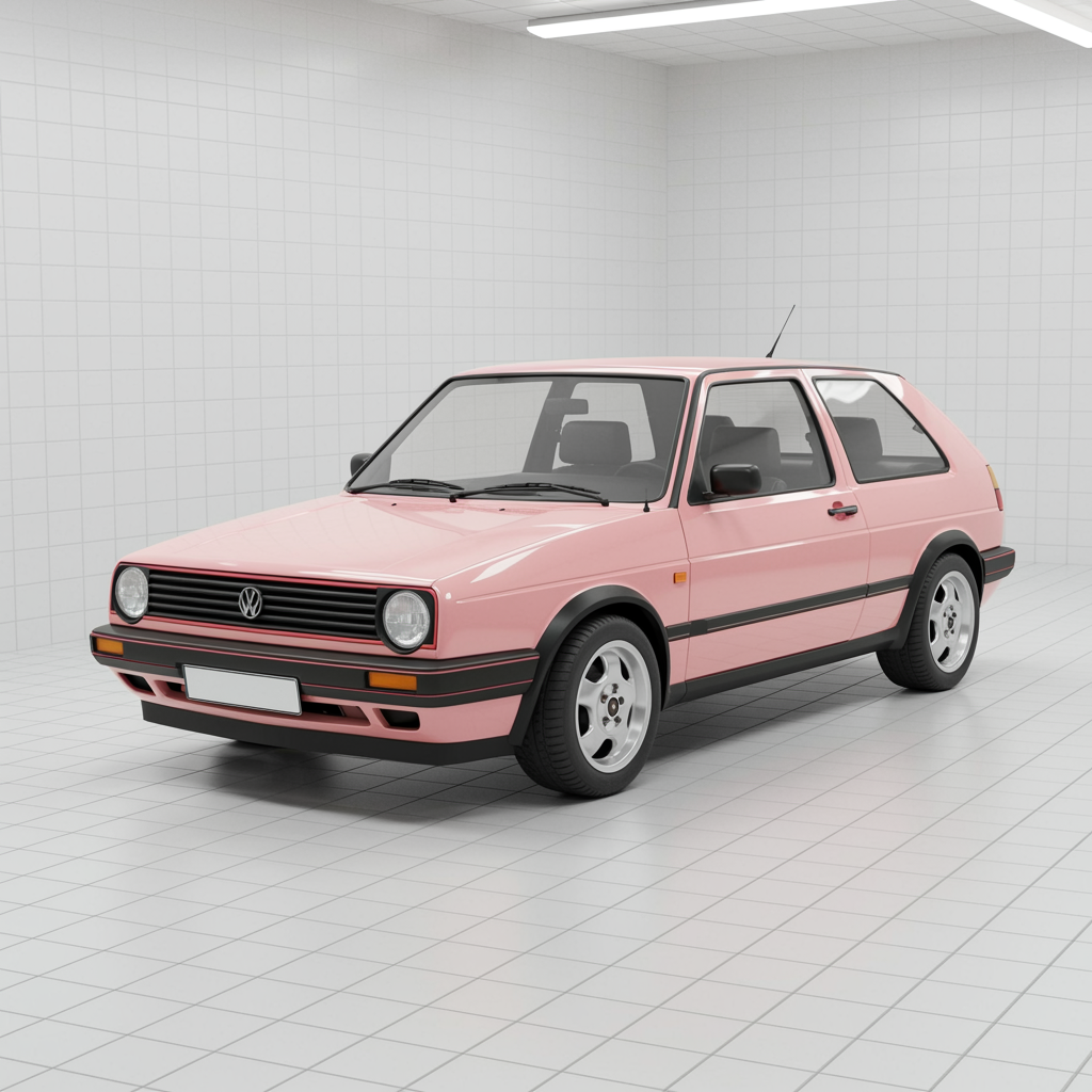 An all-white tiled room featuring a pastel pink Volkswagen Golf Mk2 GTI bathed in bright lighting, showcasing the perfect blend of pastel colors. The scene is captured with incredible attention to detail, ultra-realistic features, and professional color grading, resembling an 8k commercial photograph. The car's smooth curves and shining surfaces contrast elegantly with the minimalist background, accentuating the vibrant and cheerful essence of the setting.