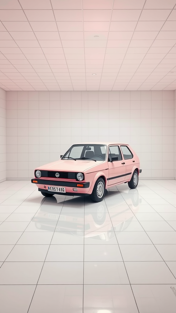 An all-white tiled room showcasing a pastel pink Volkswagen Golf Mk2 GTI, the perfect shade of pink under bright lighting highlighting every curve. The room is softly illuminated, amplifying the exquisite pastel tones. The scene is captured in ultra-high 8k resolution, revealing insanely detailed textures and fine details of the car. The composition resembles professional commercial photography with expert color grading, emphasizing the car's classic contours. The setting is serene and pristine, creating a harmonious blend of modern elegance and vintage charm within a 4:5 aspect ratio.