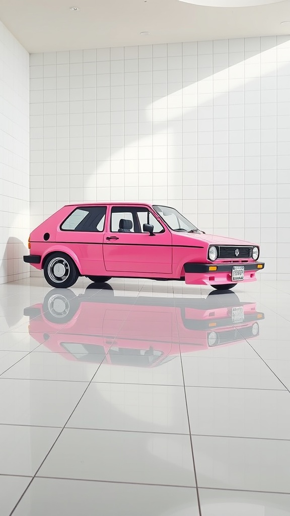 An all-white tiled room with a pristinely pink Volkswagen Golf Mk2 GTI sits under bright lighting, creating an immaculate contrast. The scene showcases perfect pastel colors, with the pink hue of the car capturing an ultra-realistic and detailed allure. The composition boasts 8k resolution quality, akin to high-end commercial photography, with professional color grading enhancing each finely tuned detail. Subtle reflections from the tiles add layers of intricacy to the setting, maintaining an overall harmonious and vibrant aesthetic.