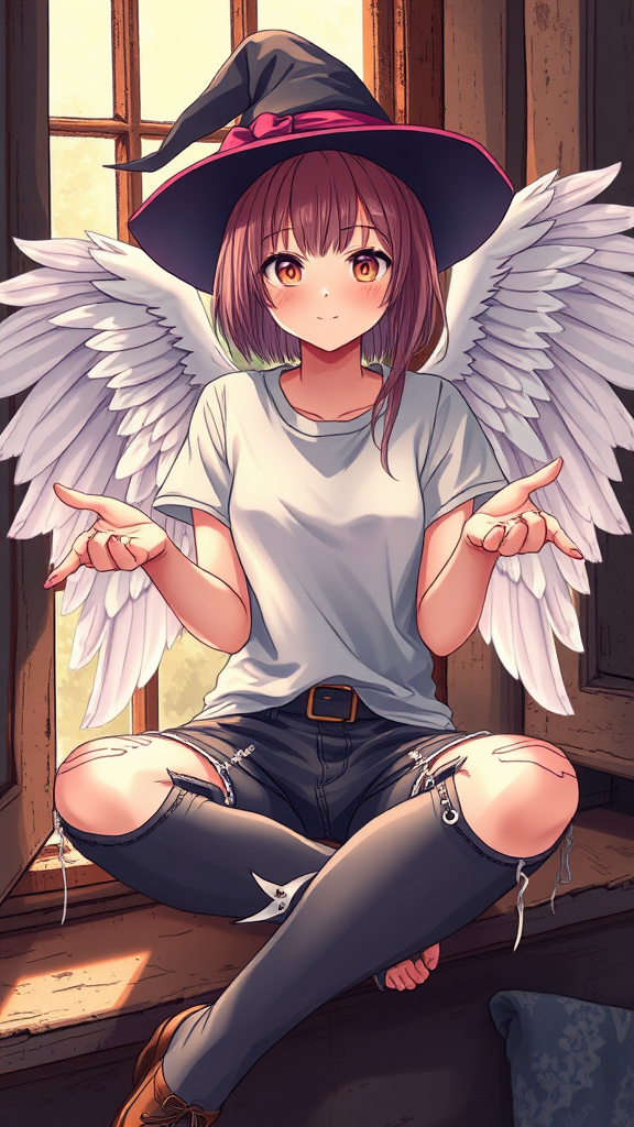 An alluring illustration of a female angel with a sweet anime-like face, sitting by an old room's window, holding a glimmering sheet of metal in her outstretched hands. She wears a punk-style t-shirt paired with chic, torn leg clothing, and a whimsical witch hat adds an enchanting flair. Her translucent wings softly shimmer in the volumetric lighting, which casts a warm glow throughout the scene. The high saturation emphasizes her sheer blush cheeks, bringing a rosy vitality to her pretty face. Despite the casual punk attire, she exudes a delicate beauty that focuses all attention on her, captured in a model-like pose. The detailed 8K rendering highlights each charming intricacy, from the textures of her punk ensemble to the ethereal quality of her wings. The overall composition beautifully maintains its core concept while offering a creatively enhanced visual experience.