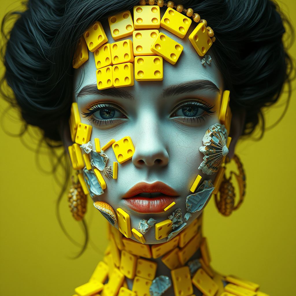 An altermodern surreal depiction of a woman's head constructed from fluorescent yellow domino pieces and shattered sea shells, reminiscent of Octopath Traveler's atmospheric style. The composition is angular, with a vanitas theme, exploring the transient beauty of existence. The vibrant yellow of the dominoes contrasts with the iridescent, fractured shells, forming a striking, raw visual narrative in an elongated 4:5 aspect ratio.
