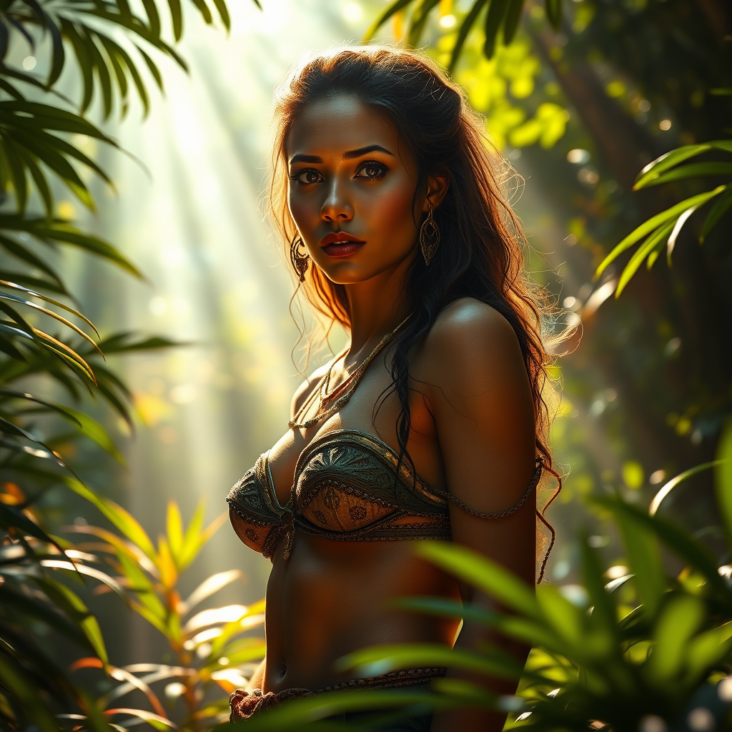 An Amazonian woman standing majestically in a lush jungle, surrounded by intricate fairy lighting casting a magical glow. Her features are captured in ultra-detail, with vibrant, bright colors enhancing the scene. Volumetric rays of light pierce through the dense foliage, creating an ethereal atmosphere. The image exhibits photorealism with hdr quality, set in a dramatic 9:16 aspect ratio, highlighting her powerful and enchanting presence amidst the natural splendor.