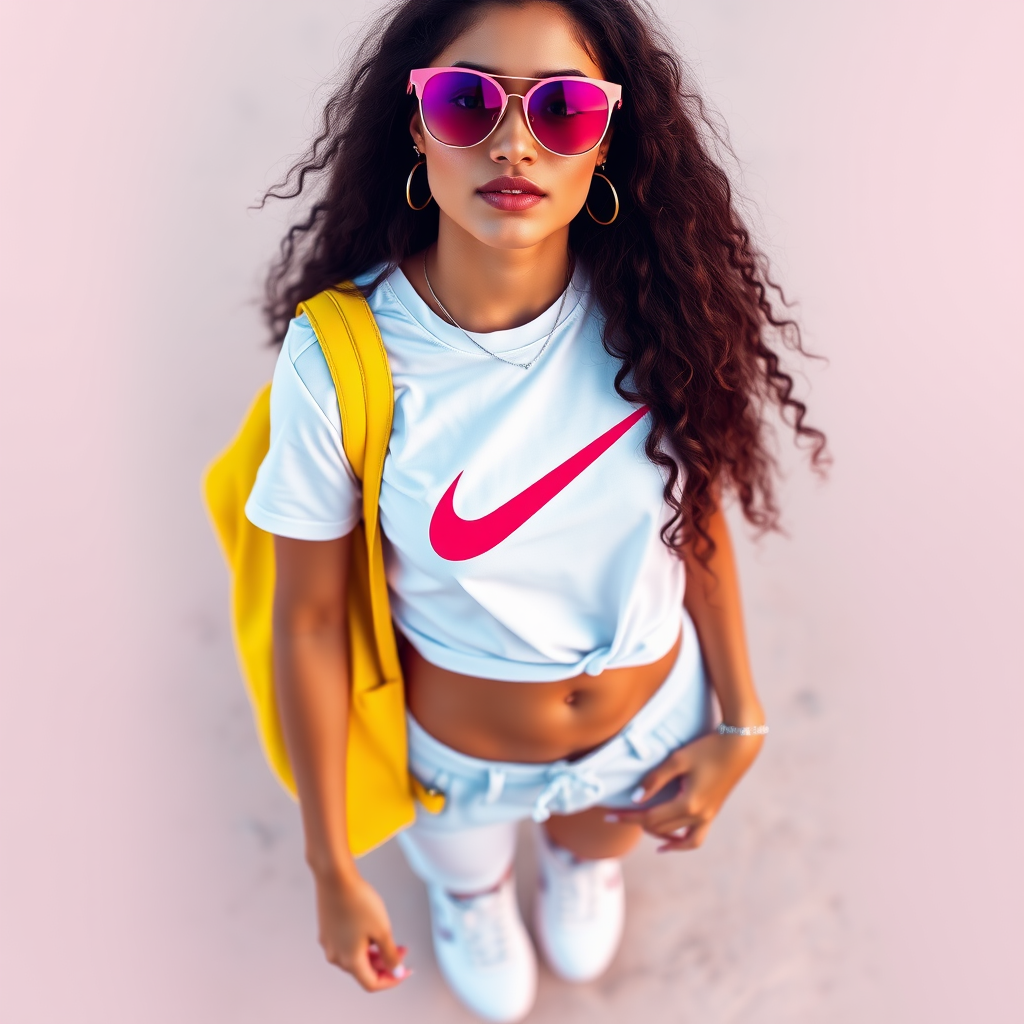 An American fashion girl, captured in full-body, wearing beachwear and stylish sunglasses. She sports a sleek white T-shirt adorned with the iconic Nike logo and pairs it with pristine white sneakers. Slung over her shoulder is a vibrant yellow backpack. The image is rendered in high definition, showcasing a photo-realistic portrait shot at 8k resolution. The dominant color theme is a lively #ff7ad2 pink. The scene is purposefully arranged in a knolling style, shot from above with a focus on detail, including data visualization elements integrated into the composition.